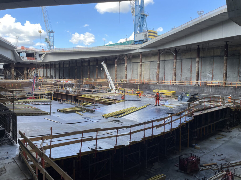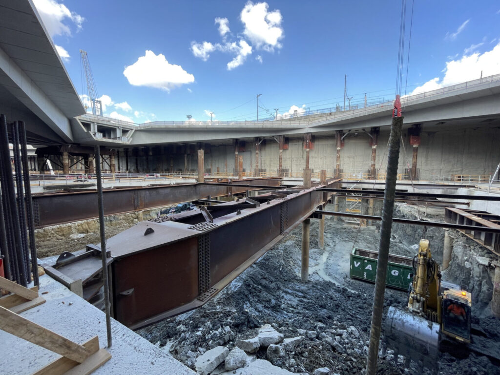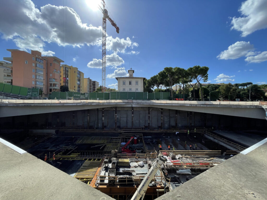 La stazione, lunga circa 460 metri e larga 52 metri, sarà parzialmente interrata e realizzata con il metodo costruttivo topdown, che consente di costruire progressivamente le strutture definitive durante l’avanzare dello scavo, garantendo al tempo stesso il contrasto dei diaframmi e la stabilità dell’opera.